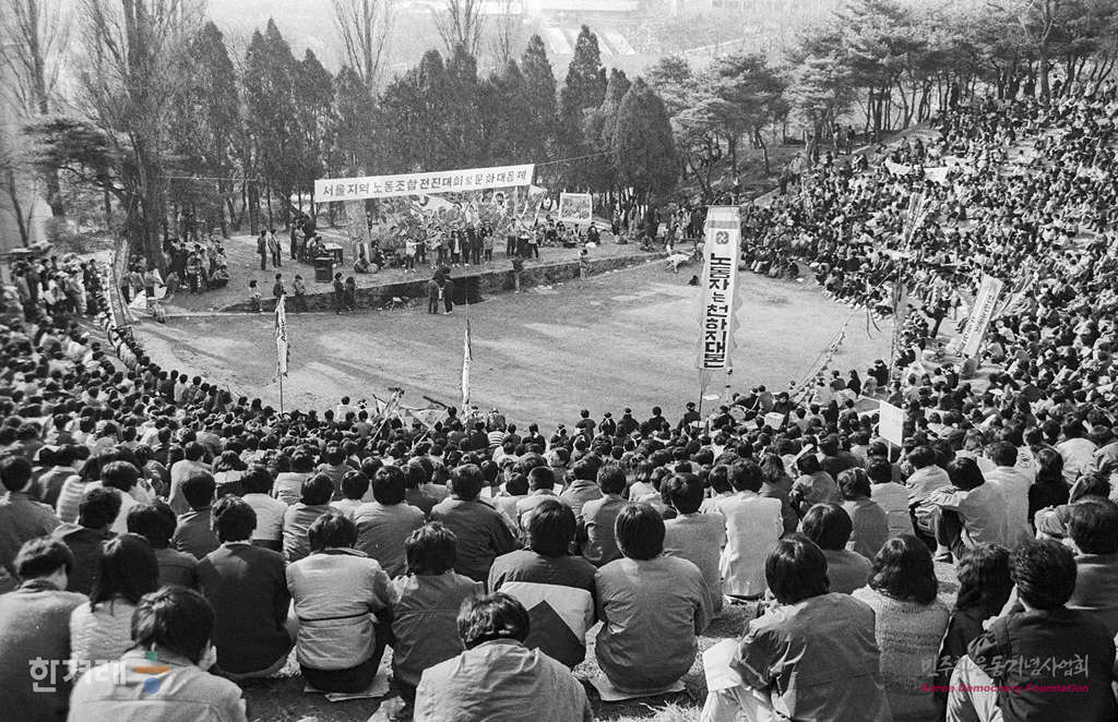 - 1988년 3월 13일 서울지역 노동자 전진대회 및 문화대동제가 열린 연세대 노천극장에서 참석한 3천여명의 학생과 노동자들이 민주노조쟁취를 외치며 집회를 하고 있다.