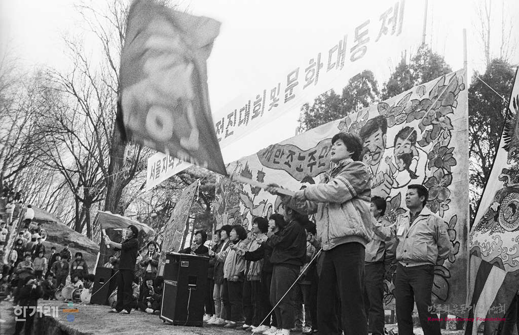 - 1988년 3월 13일 서울지역 노동자 전진대회 및 문화대동제가 열린 연세대 노천극장에서 참석한 3천여명의 학생과 노동자들이 민주노조쟁취를 외치며 집회를 하고 있다.