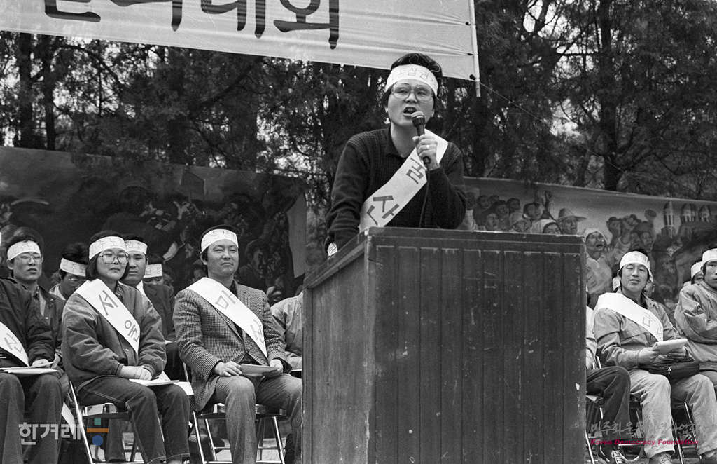 - 1988년 4월 2일 현대그룹 노조 탄압 규탄 밑 구속 노동자 석방촉구 전국 노동자 결의대회가 서울 연세대 노천극장에서 열려 경찰의 저지선을 뚫고 들어온 노동자 학생들이 노동탄압 구호를 외치고 있다.