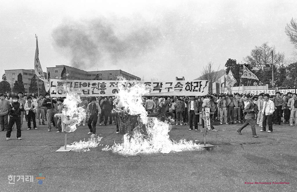 - 1988년 4월 2일 현대그룹 노조 탄압 규탄 밑 구속 노동자 석방촉구 전국 노동자 결의대회가 서울 연세대 노천극장에서 열려 집회를 마친 참가자들이 정주영회장과 노태우대통령을 상장하는 허수아비를 교문밖으로 가져와 화형식을 하고 있다