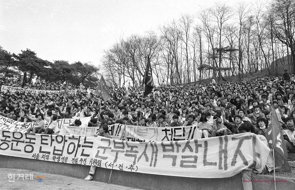 - 1988년 4월 2일 현대그룹 노조 탄압 규탄 밑 구속 노동자 석방촉구 전국 노동자 결의대회가 서울 연세대 노천극장에서 열려 경찰의 저지선을 뚫고 들어온 노동자 학생들이 노동탄압 구호를 외치고 있다.