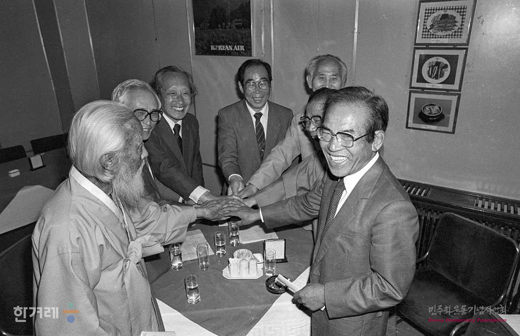 - 1988년 5월 11일 함석헌 선생을 비롯한 재야 원로들이 서울 YMCA레스토랑에서 올림픽 남북공동개최 설명을 발표하고 있다.