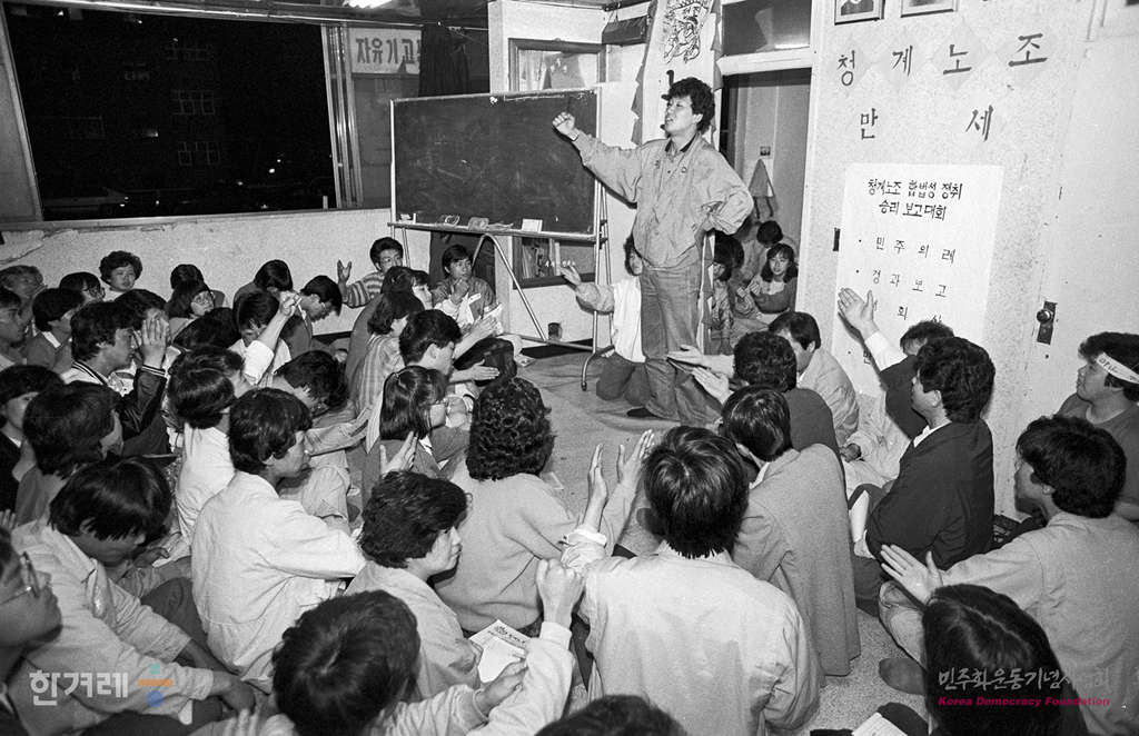 - 1988년 5월 3일 전태일열사 분신 직후인 1970년 11월 27일 노동조합이 결성돼 81년 강제해산 당한 이후 2일 오후 5시 50분경 관한 종로구청으로부터 노조설립 신고필증을 교부받아 7년만에 합법성을 되찾게 된 청계피복노조 조합원들이 서울 동대문구 노조사무실에서 합법성쟁취 승리보고대회를 하고 있다.