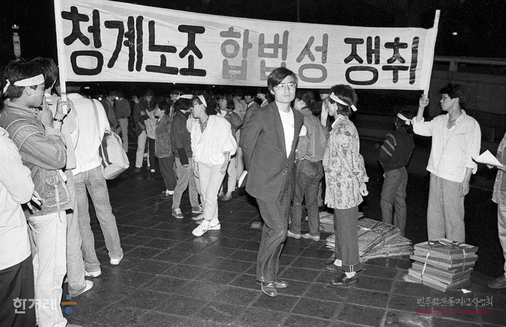- 1988년 5월 3일 전태일열사 분신 직후인 1970년 11월 27일 노동조합이 결성돼 81년 강제해산 당한 이후 2일 오후 5시 50분경 관한 종로구청으로부터 노조설립 신고필증을 교부받아 7년만에 합법성을 되찾게 된 청계피복노조 조합원들이 서울 동대문구 노조사무실에서 합법성쟁취 승리보고대회를 하고 있다.