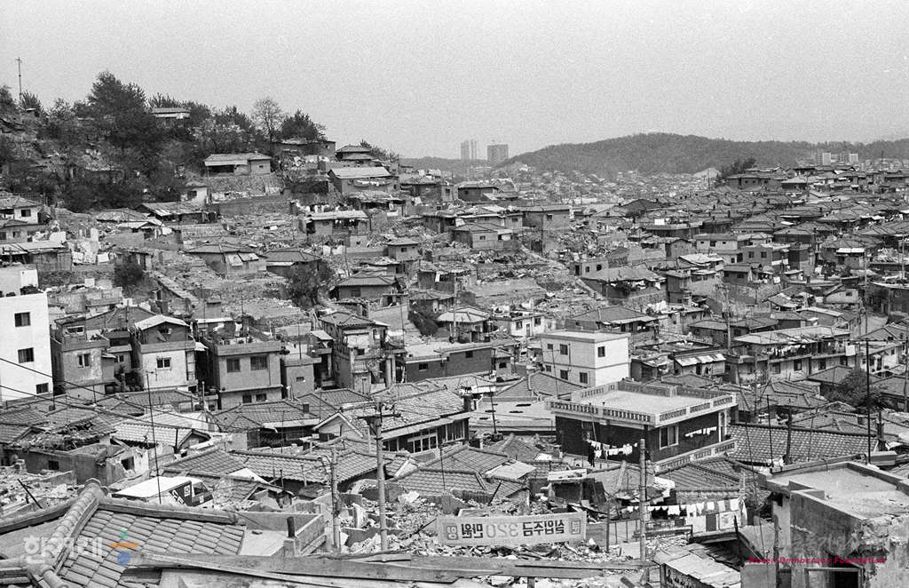 - 1988년 5월 8일 서울 낙산지구 주민들이 자신들이 살던 재개발지역에 예전 건물들이 허물어진 모습을 둘러보고 있다. 1986년 아시안게임과 1988년 서울올림픽 유치로 1980년대 초반부터 도심부 재개발로 인해 서울은 수많은 철거민을 양산했다.