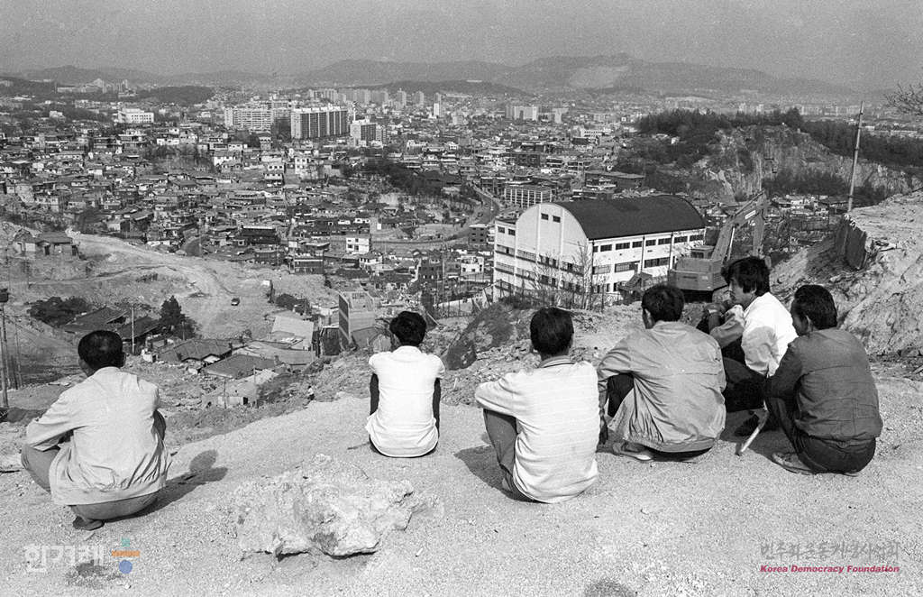 - 1988년 5월 8일 서울 낙산지구 주민들이 자신들이 살던 재개발지역에 예전 건물들이 허물어진 모습을 둘러보고 있다. 1986년 아시안게임과 1988년 서울올림픽 유치로 1980년대 초반부터 도심부 재개발로 인해 서울은 수많은 철거민을 양산했다.