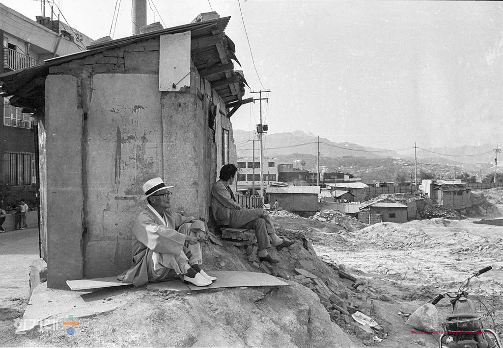 - 1988년 5월 8일 서울 낙산지구 주민들이 자신들이 살던 재개발지역에 예전 건물들이 허물어진 모습을 둘러보고 있다. 1986년 아시안게임과 1988년 서울올림픽 유치로 1980년대 초반부터 도심부 재개발로 인해 서울은 수많은 철거민을 양산했다.