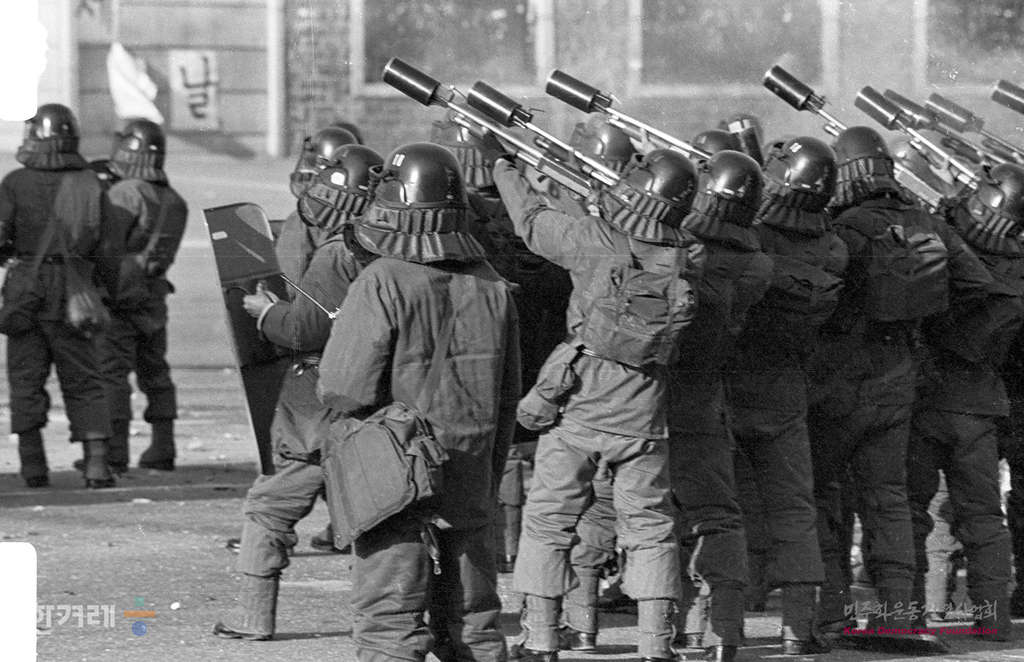 - 1988년 5월 1일 서울지역 노동조합 조합원들과 학생들이 서울 연세대 노천극장에서 노동자의 날 기념 노동3권 쟁취 수도권노동자대회를 마친뒤 교문밖진출을 시도하자 경찰이 최루탄을 쏘며 저지하고 있다.