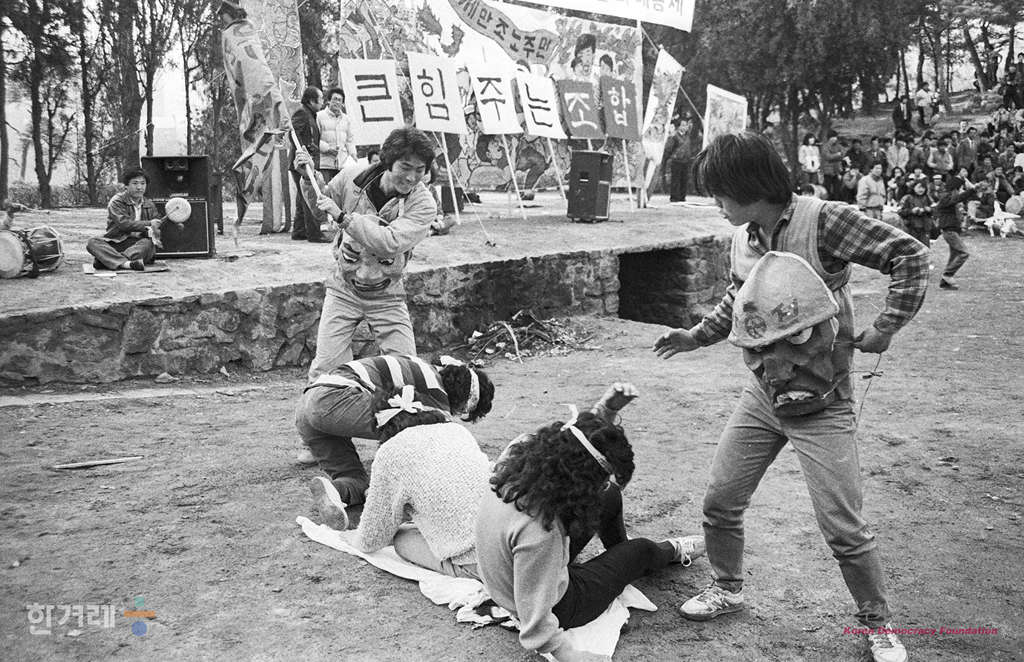 - 1988년 3월 13일 서울지역 노동자 전진대회 및 문화대동제가 열린 연세대 노천극장에서 3천여명의 학생과 노동자들이 참석한 가운데 공연단이 행위극을 하고 있다.