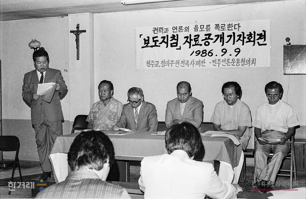 - 1986.09.09. 권력과 언론이 야합하여 국민을 오도해 왔던 ‘보도지침’을 폭로 고발한 언론인들이 구속되자 천주교 정의구현 전국사제단과 민주언론운동협의회는 기자회견을 갖고 ‘보도지침’자료를 공개하고 있다.