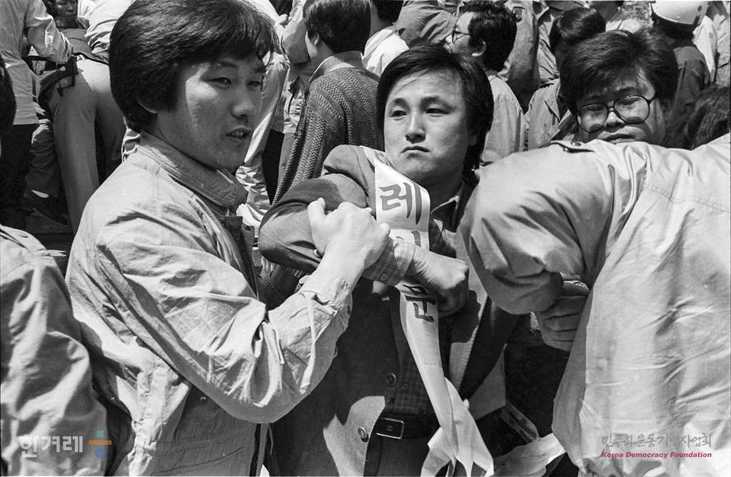 - 1988년 4월 22일 국민의 성금으로 만들어진 한겨레신문 기자와 사원들이 이유없이 등록증 교부를 석달간 미루는 것에 항의하며 서울 세종문화회관 계단에서 시위를 벌이다 경찰에 연행되고 있다.