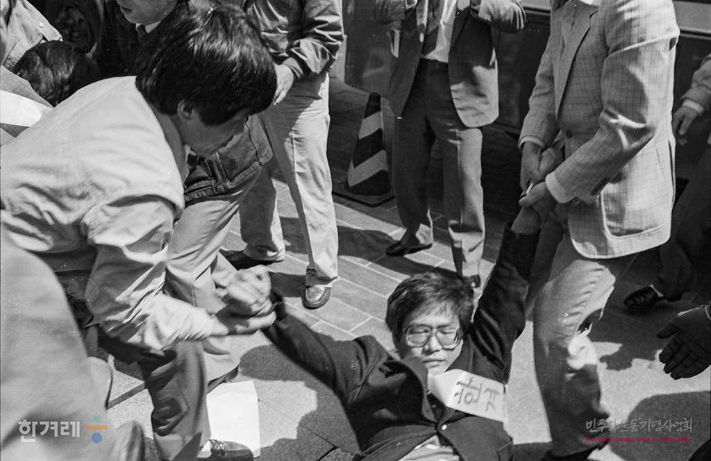 - 1988년 4월 22일 국민의 성금으로 만들어진 한겨레신문 기자와 사원들이 이유없이 등록증 교부를 석달간 미루는 것에 항의하며 서울 세종문화회관 계단에서 시위를 벌이다 경찰에 연행되고 있다