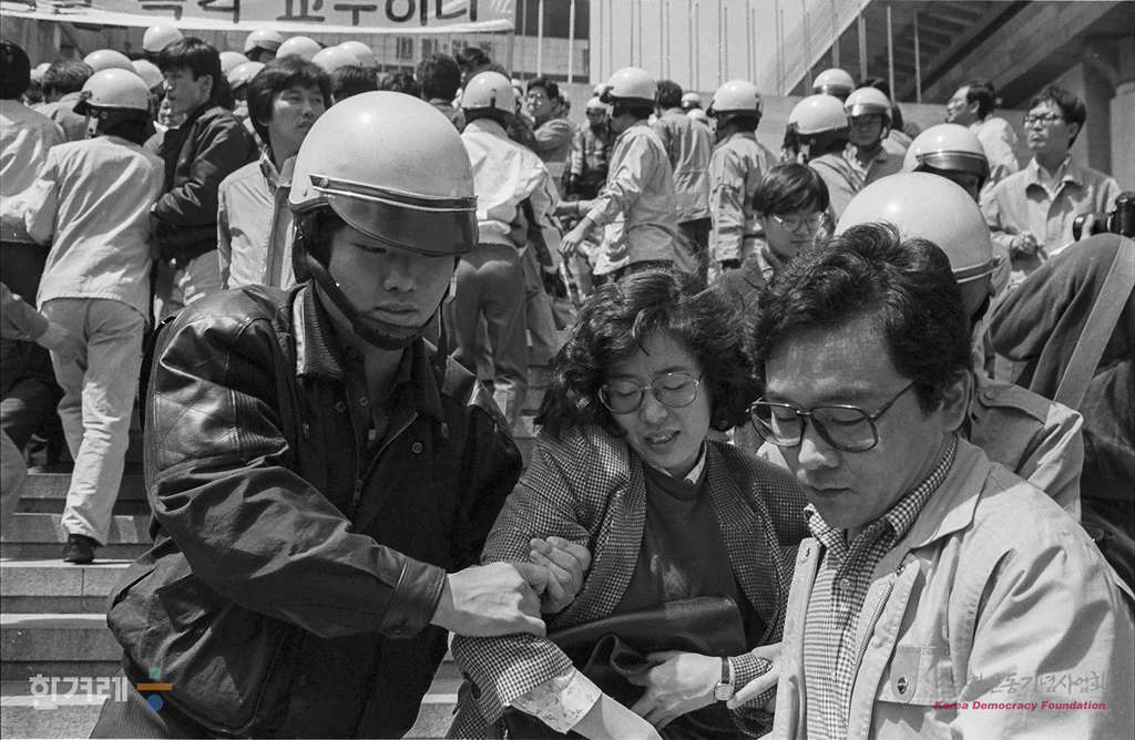 - 1988년 4월 22일 국민의 성금으로 만들어진 한겨레신문 기자와 사원들이 이유없이 등록증 교부를 석달간 미루는 것에 항의하며 서울 세종문화회관 계단에서 시위를 벌이다 경찰에 연행되고 있다