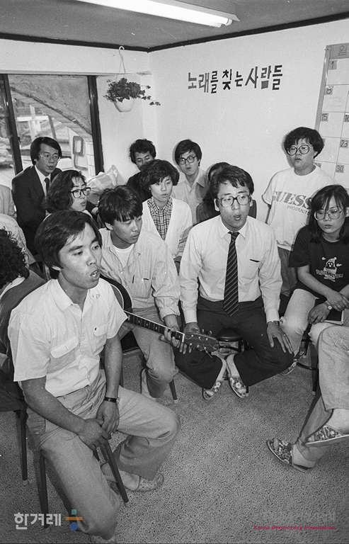 - 1988년 5월.13일 80년대 군부독재에 맞선 민주화 투쟁과정에서 많이 불리던 민중가요 노래패들들이 활동한 민중가요 노래패 노래를 찾는 사람들이 오늘 6월 10일 연세대 노천극장에서 제2회 민중문화의 날 행사의 일환으로 열릴 예정인 ‘저평등의 땅에’ 공연을 앞두고 연습을 하고 있다.