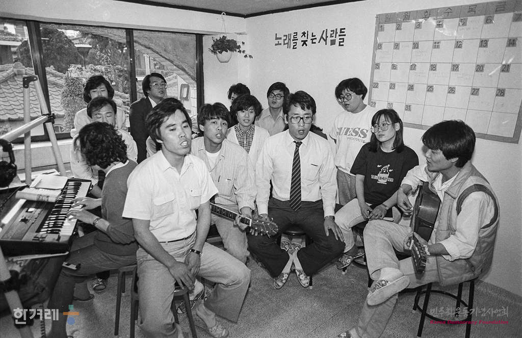 - 1988년 5월.13일 80년대 군부독재에 맞선 민주화 투쟁과정에서 많이 불리던 민중가요 노래패들들이 활동한 민중가요 노래패 노래를 찾는 사람들이 오늘 6월 10일 연세대 노천극장에서 제2회 민중문화의 날 행사의 일환으로 열릴 예정인 ‘저평등의 땅에’ 공연을 앞두고 연습을 하고 있다.