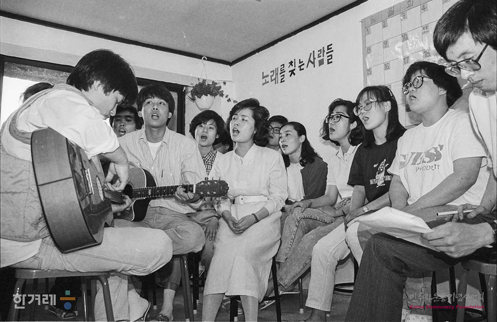 - 1988년 5월.13일 80년대 군부독재에 맞선 민주화 투쟁과정에서 많이 불리던 민중가요 노래패들들이 활동한 민중가요 노래패 노래를 찾는 사람들이 오늘 6월 10일 연세대 노천극장에서 제2회 민중문화의 날 행사의 일환으로 열릴 예정인 ‘저평등의 땅에’ 공연을 앞두고 연습을 하고 있다.