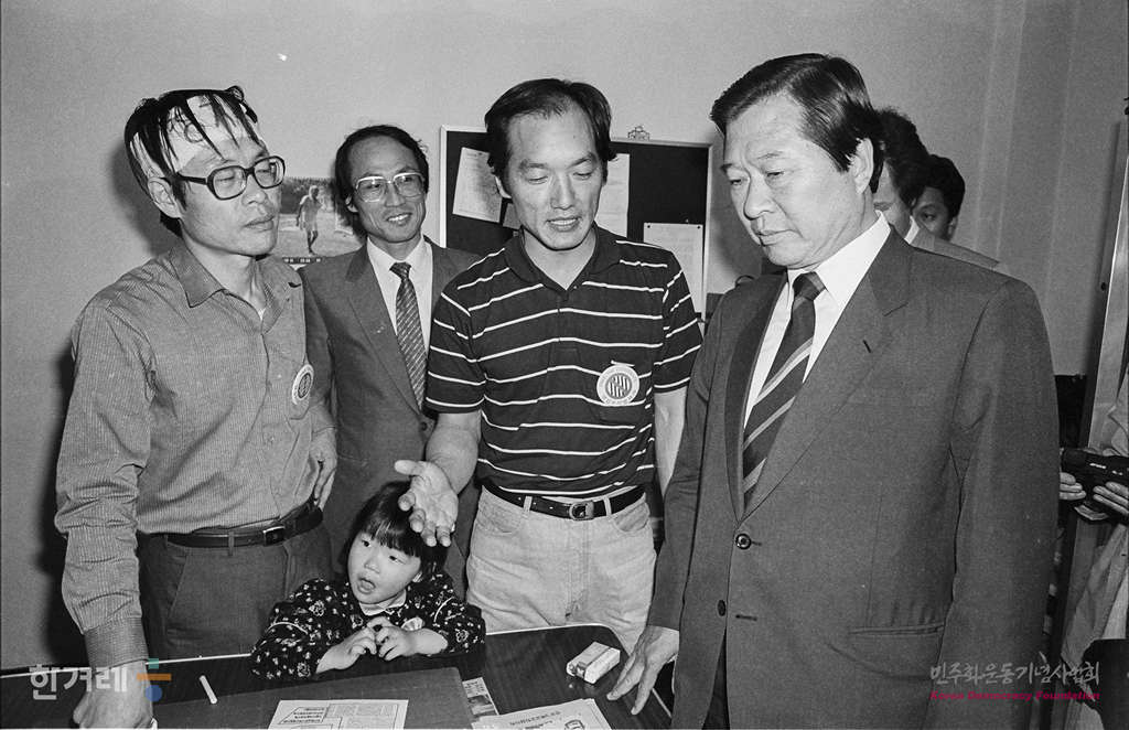 - 1988년 5월 14일 김대중 평화민주당 총재가 지난 12일 밤부터 서울 명동 카톨릭센터 6층 카톨릭정의평화위원회 사무실에서 ‘양심수 전원석방’과 ‘수배해제’를 요구하며 농성중인 구속자 가족과 수배자, 본인, 재야인사를 만나고 있다.