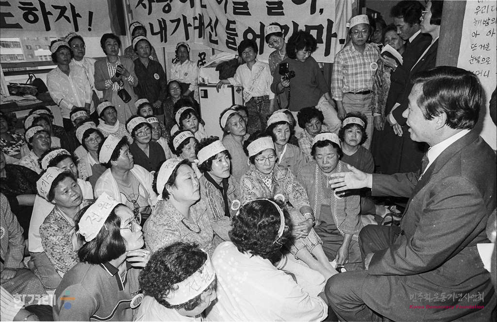 - 1988년 5월 14일 김대중 평화민주당 총재가 지난 12일 밤부터 서울 명동 카톨릭센터 6층 카톨릭정의평화위원회 사무실에서 ‘양심수 전원석방’과 ‘수배해제’를 요구하며 농성중인 구속자 가족과 수배자, 본인, 재야인사를 만나고 있다.