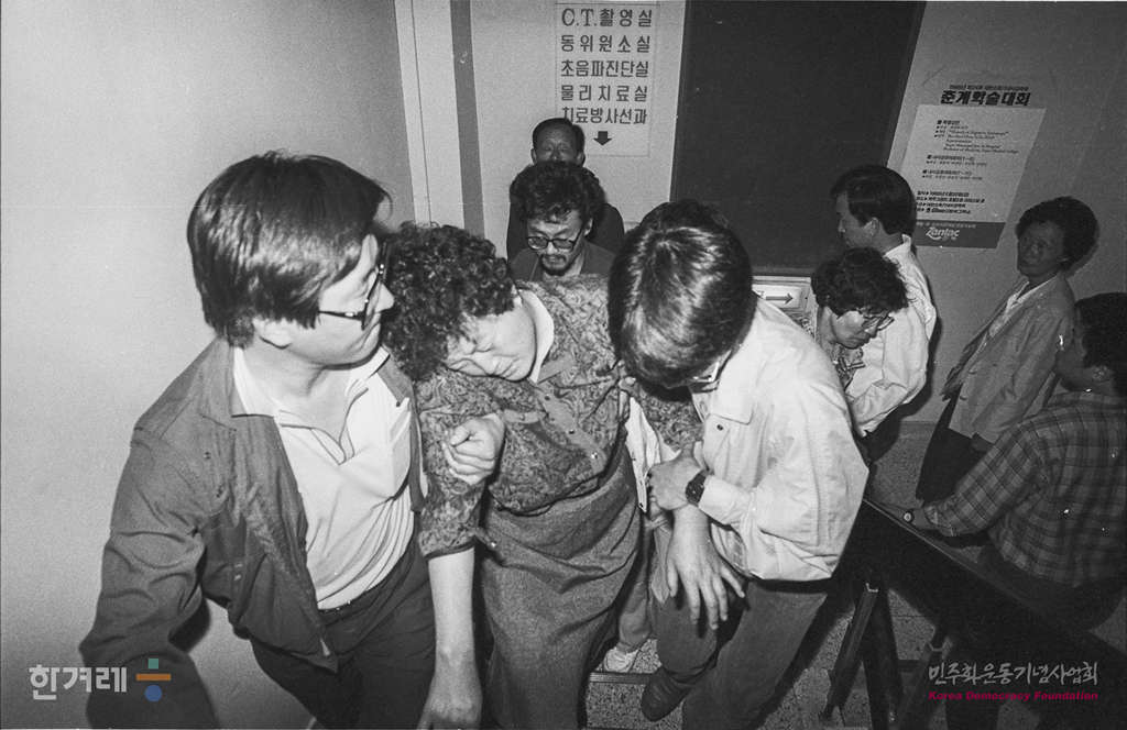 - 1988년 5월 15일 양심수 전원석방과 조국통일을 외치며 서울 중구 명동성당 구내 카톨릭교육관 3층 옥상에서칼로 배를 찌르고 12m아래로 투신해 사망한 카톨릭 민속연구회장 조성만씨가 안치중인 서울 백병원 영안실에 아들의 소식을 듣고 전주에서 온 조씨의 어머니 김복성씨가 오열을 터뜨리고 있다.