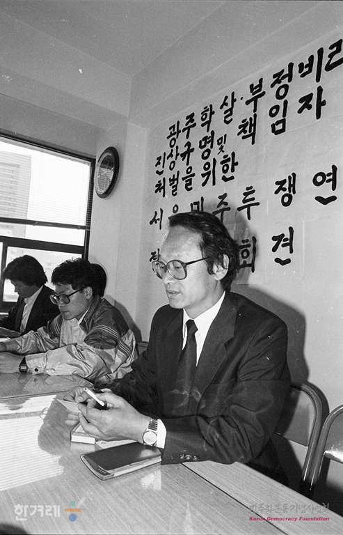 - 광주학살 부정비리 진상규명 및 책임자 처벌을 위한 서울민주투쟁연합 이부영의장이 518광주항쟁 8주년을 맞아 5.18 민주영령을 추모하는 조기를 전국 행정관에서 게양할 것을 요구하고 양심수 전원석방과 수배해제 사면복권등을 요구하는 기자회견을 하고 있다.