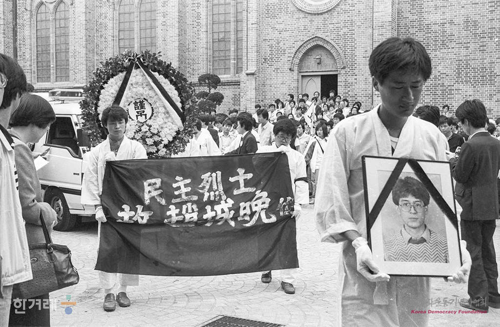 - 1988년 5월 16일 양심수 전원석방과 조국통일을 외치며 서울 중구 명동성당 구내 카톨릭교육관 3층 옥상에서칼로 배를 찌르고 12m아래로 투신해 사망한 이후 고 조성만열사 시신이 안치된 백병원에서 민주국민장을 준비하는 명동성당 영안실로 옮겨지고 있다.