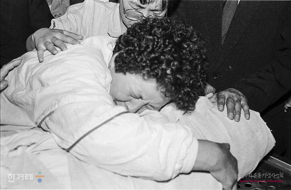 - 1988년 5월 17일 저녁8시 서울 명동성당 영안실에서 고 조성만씨 어머니가 입관 직전 아들의 모습을 마지막으로 보며 작별을 하고 있다.