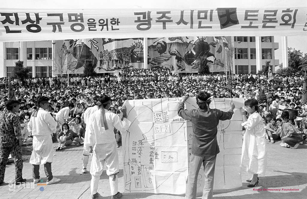 - 1988년 5월 17일 광주 전남대 5.18 광장에서 시민들과 학생들이 참석한 가운데 광주학살 진상규명 토론회가 열리고 있다.