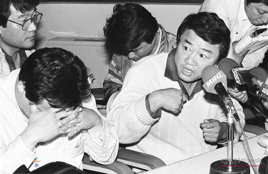 - 1988년 5월 18일 현대건설 노조위원장 서정의씨 피랍사건과 관련해서 경찰의 수사가 진행되는 가운데 납치 행동두목 박상린씨와 김규동씨가 함께 수사본부인 서울 서초경찰서에 자수한 뒤 기자들의 질문을 받고 있다.