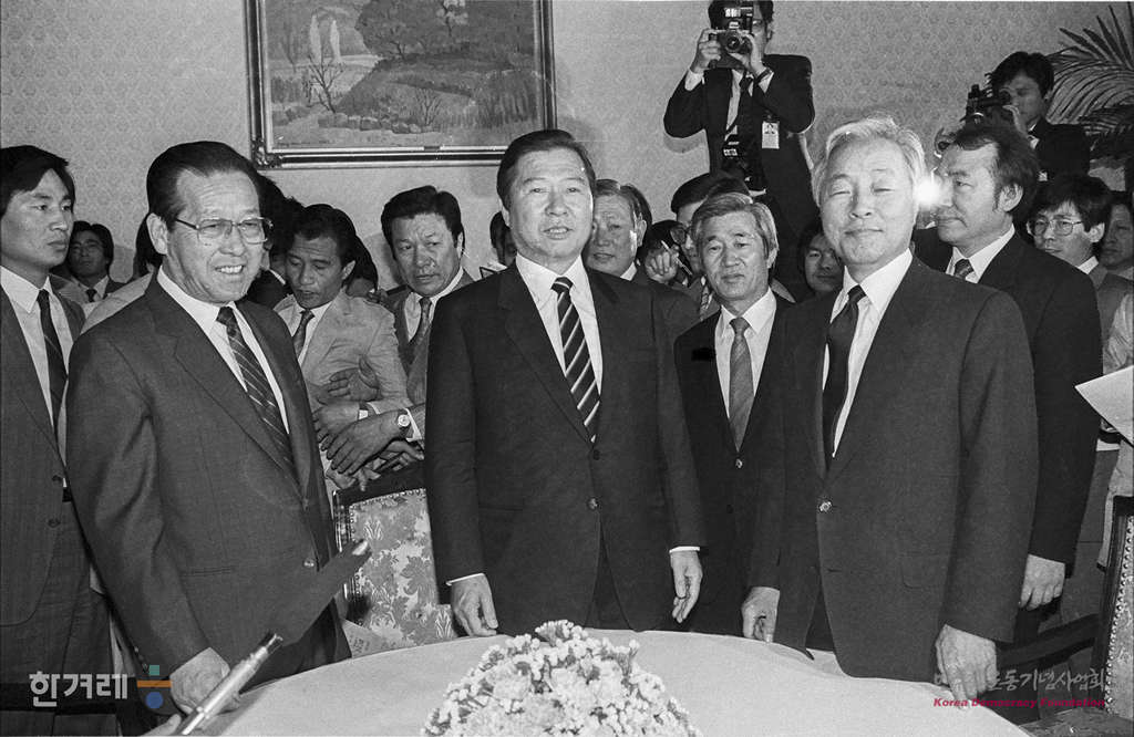 - 1988년 5월.18일 국회 귀빈식당에서 13대 개원국회를 앞두고 김종필 김대중 김영삼 세 야당총재회담을 갖고 있다. 이날 회담에선 광주항쟁 진상규명, 제5공화국비리조사. 대통령 및 국회의원 선거부정 등 최근의 정치현안에 대한 국정감사권을 발동하기로 합의했다.