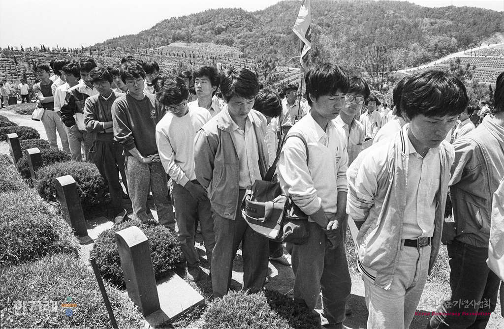 - 1988년.5월 18일광주민중항쟁 8돌을 맞아 광주의거유족회의 주최로 유족과 시민, 학생들이 망월동 묘소에서 추모제를 갖마친 뒤 묘소를 참배하고 있다