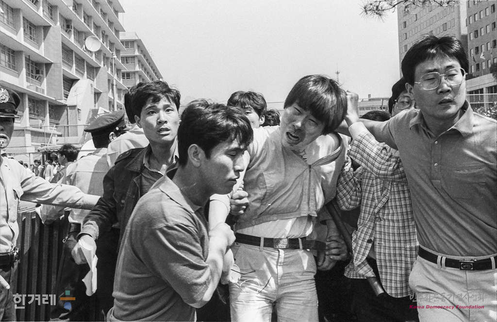 - 1988년 5월 20일. 오전 11시30분 서울 종로구 세종로 주한 미국대사관에 박용익씨 등 대학생 7명이 4개의 사제폭발물을 던지고 이중 5명이 대사관 안으로 들어가 시위를 벌이다 전원 경찰에 연행되고 있다.