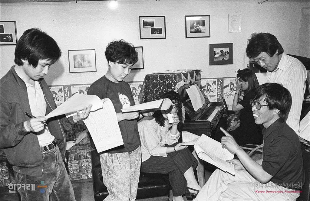 - 1988년 5월 26일 한국적 민족음악을 모색하는 작곡가 모임인 제3세대를 대표하는 이건용(서울대 음대교수)를 비롯해 강준일씨, 대금 무형문화재 김철호씨 등 세명의 작곡가가 공동작곡하며 새로운 음악극 운동의 기수격인 문호근씨가 연출한 <구로동연가>가 무대에 오른다. 사진은 <구로동연가> 연습실에서 촬영했다. 오른쪽부터 대본과 주연의 원창연, 작곡가 강준일 연출가 김호근