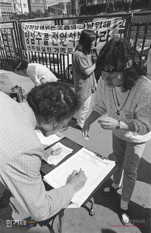 - 1988년 5월 25일 민주화실천 가족협의회는 서울 명동성당 입구에서 양심수 전원석방과 특별법 제정을 위한 서명운동을 벌이고 있다. 이날 하룻동안 2천여명의 서명을 받은 민가협은 27일까지 1차 서명을 받은 뒤 정부특 대응을 보고 서명운동의 계속여부를 결정할 예정이다.
