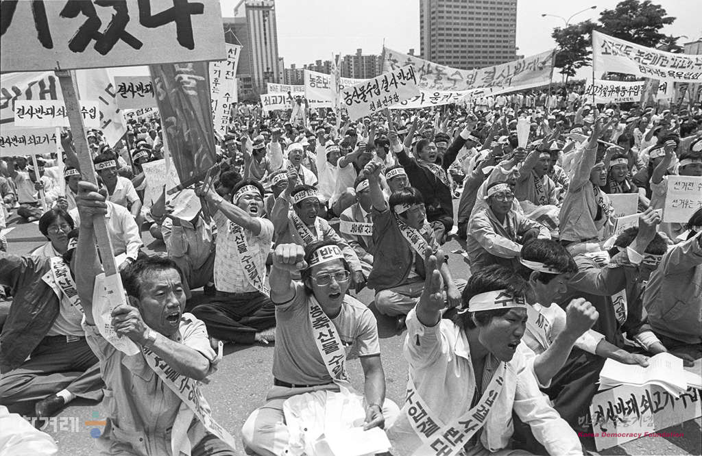 - 1988년 5월 26일.경찰의 원천봉쇄조치에도 불구하고 농수산물 수입을 반대하는 전국농민결의대회가 전국 각지에서 온 농민들과 주요 야당대표들이 동참한 가운데 서울 여의도 광장에서 열려 농축산물 수입반대 구호를 외치고 있다. 결의대회를 마친뒤 농민들은 국회의사당앞에서 시위를 벌이다 경찰에 강제해산 당했다.