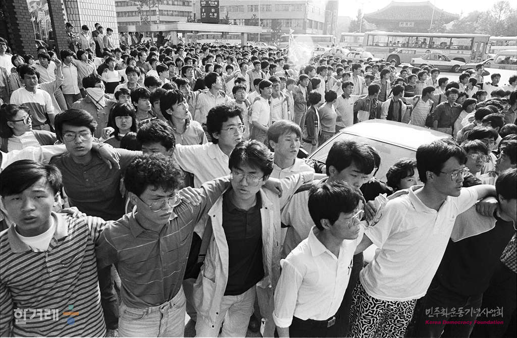 - 1988년 5월 27일 오후 6시 학생 시민들이 서울 시청 앞 광장에서 광주학살원흉처단 및 배후조종 미국규탄 범국민대행진을 시도하다 경찰과 대치하고 있다. 이날 행사는 경찰의 원천봉쇄로 열리지 못해 참가한 시민들이 서울 시내 곳곳에서 산발적 시위를 벌였다.