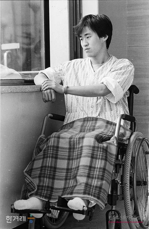 - 1988년 5월 28일 지난 1987년 12월 16일 대통령선거공정감시단 일원으로 참여했다가 구로구청 부재자투표함 부정시비와 관련한 항의농성중 경찰의 무자비한 진압과정에서 척구가 부러지는 참변을 당한 양원태( 서울대 경영학3 )시가 고려대 부속 구로병원 601호 병실에서 창밖을 내다보고 있다.