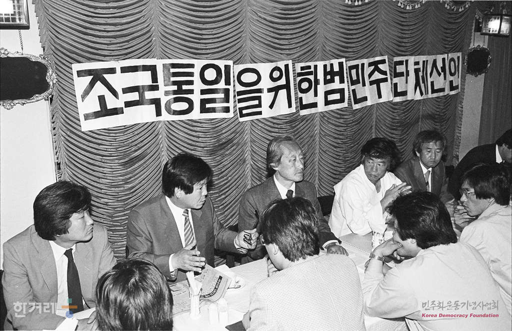 - 1988년 5월 29일 재야인사 20여명이 기독교 100주년 기념관에서 전국 67개 민주사회단체대표자 명의로 조국통일의 대업을 앞당기고 남북공동 올림픽추진과 6.10 남북학생회담의 성사를 촉구하는 기자회견을 하고 있다.