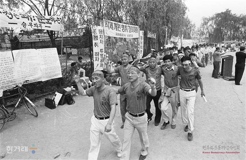 - 1988년 5월.31일 오전 10시30분 서울지하철공사 노동조합 조합원 1천5백여명은 서울 성동구 용답동 군자차량기자앞 용답축구장에 모여 직제개편 쟁취 결의대회를 하고 있다.