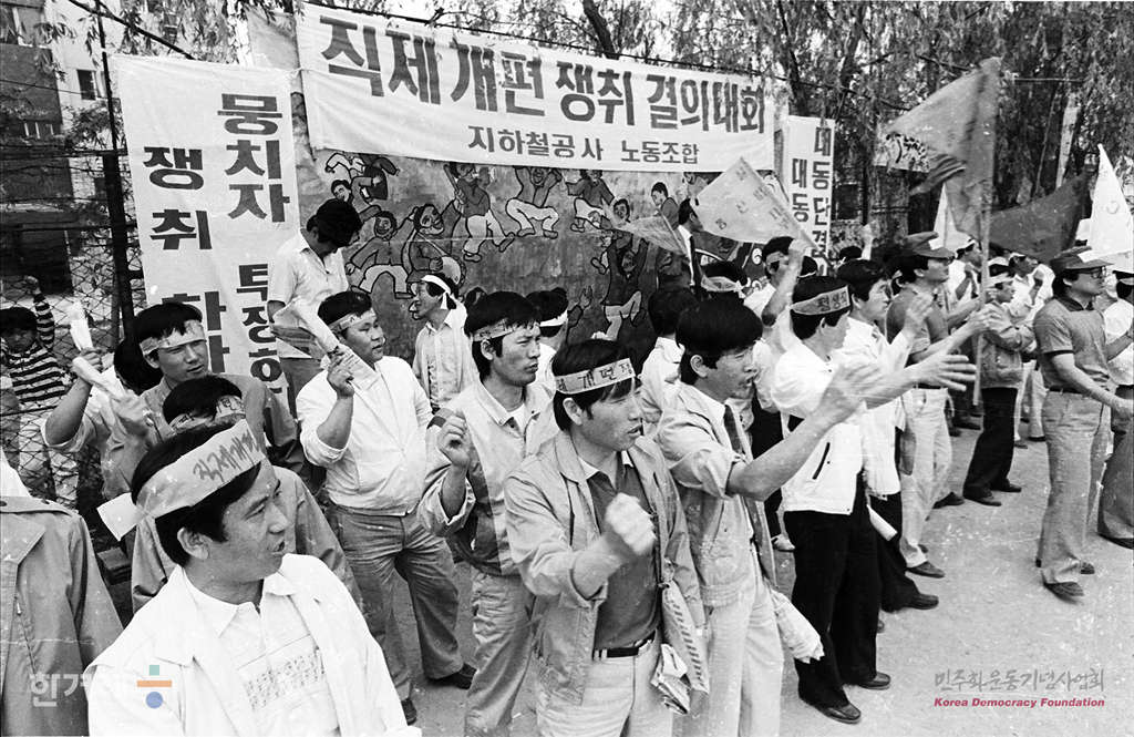 - 1988년 5월.31일 오전 10시30분 서울지하철공사 노동조합 조합원 1천5백여명은 서울 성동구 용답동 군자차량기자앞 용답축구장에 모여 직제개편 쟁취 결의대회를 하고 있다.