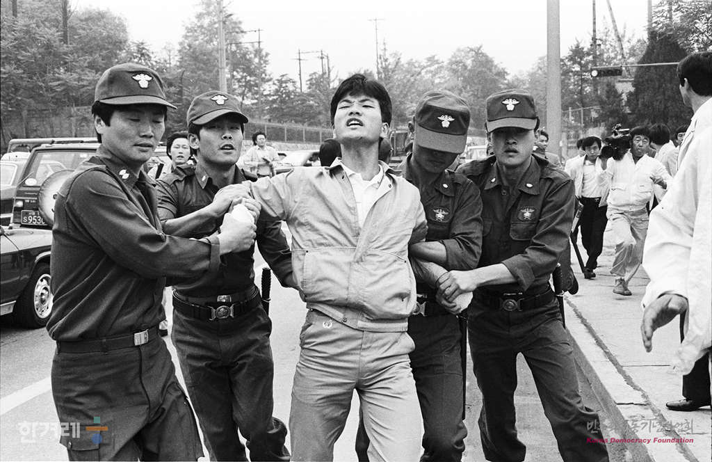 - 1988년 6월.4일 오후 1시 35분 서울지역 총학생회연합 산하 6.10 남북학생회담 남한쪽 준비위원회 통일결사대 소속 대학생 4명이 판문점 출입허가를 받기위해 서울 용산구 용산동 미8군 사령부로 향하다 경찰에 연행되고 있다.