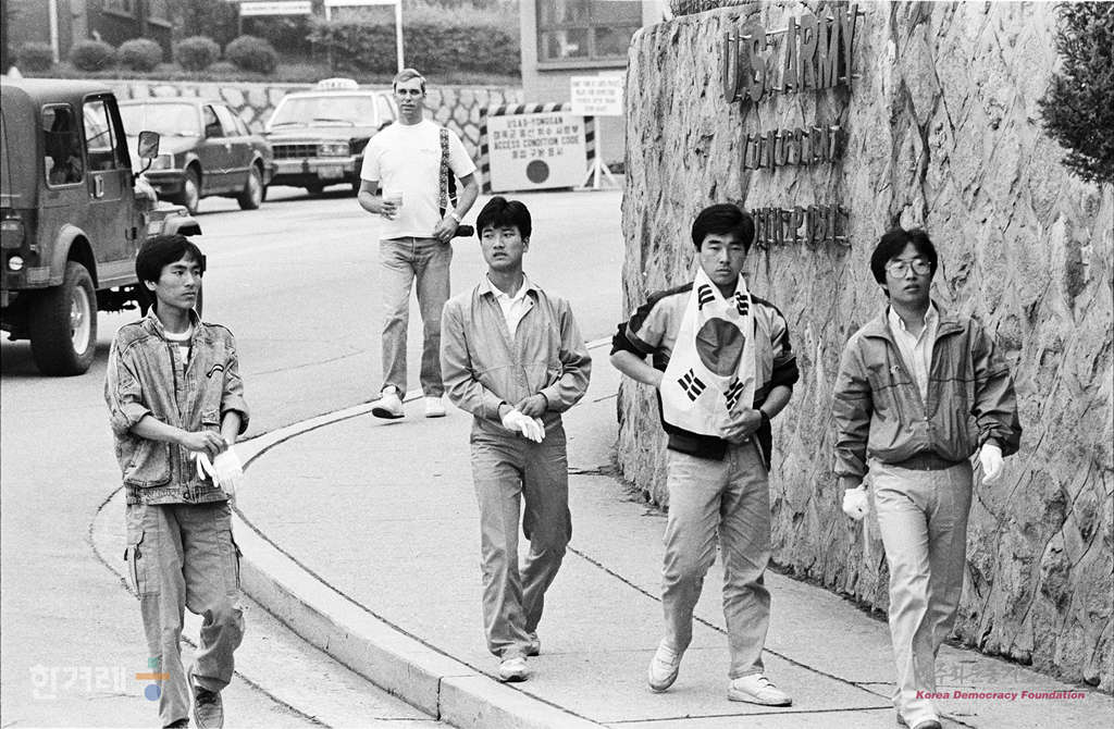 - 1988년 6월.4일 오후 1시 35분 서울지역 총학생회연합 산하 6.10 남북학생회담 남한쪽 준비위원회 통일결사대 소속 대학생 4명이 판문점 출입허가를 받기위해 서울 용산구 용산동 미8군 사령부로 향하다 경찰에 연행되고 있다.