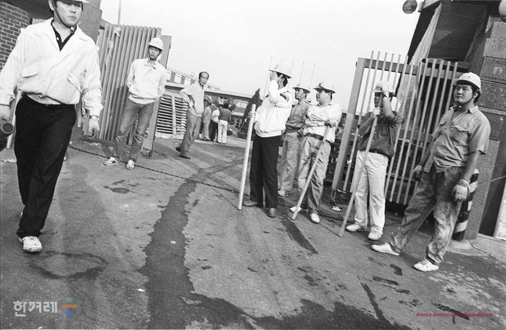 - 1988년 6월.6일 아남정밀안전모와 노란색 비표를 착용한 구사대 2백여명이 대한광학 농성근로자 60명을 끌어내 경찰차에 강제로 싣고 있다.