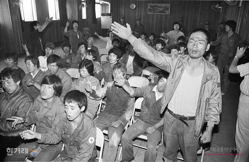 - 1988년 6월.6일 아남정밀안전모와 노란색 비표를 착용한 구사대 2백여명에 의해 강제해산되어 서울 남부경찰서로 연행된 대한광학 농성근로자들이 구사대의 폭력에도 경찰의 묵인에 항의하며 구호를 외차고 있다.