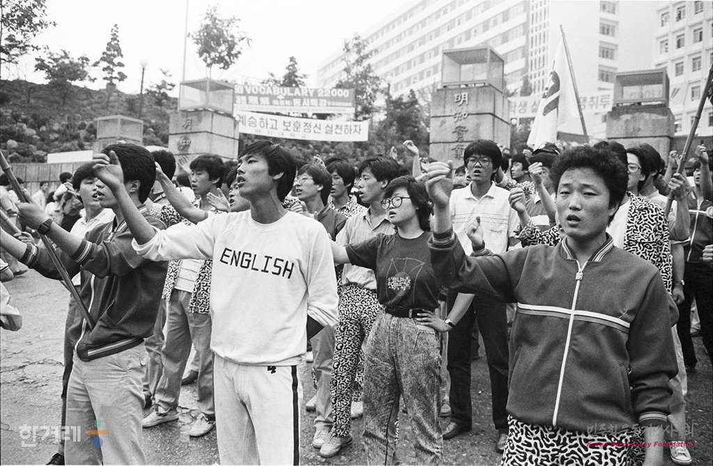 - 1988년 6월.8일 오후4시 한미군사예속철폐 및 6.10 실무회담 쟁취를 위한 서부지구 대학생 결의대회가 서울 명지대 운동장에서 열려 참가한 대학생들이 교문밖에서 구호를 외치고 있다.
