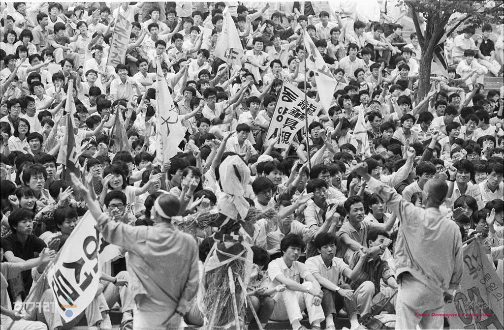 - 1988년 6월 9일 정부의 원천봉쇄 방침에 따른 강경대응에도 불구하고 6.10남북학생회담을 강행하기로 한 가운데 서울대 대학생들이 아크로폴리스광장에서 출정식을 하고 있다.