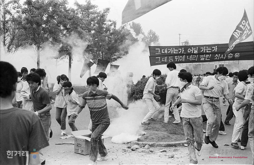 - 1988년 6월 9일 정부의 원천봉쇄 방침에 따른 강경대응에도 불구하고 6.10남북학생회담을 강행하기로 한 가운데 경찰의 봉쇄를 뚫고 들어온 대학생들은 연세대 대운동장에서 6.10회담 성사를 위한 백만학도 총귈기대회를 갖은 뒤 교문을 사이에 두고 경찰과 투석전을 벌이고 있다
