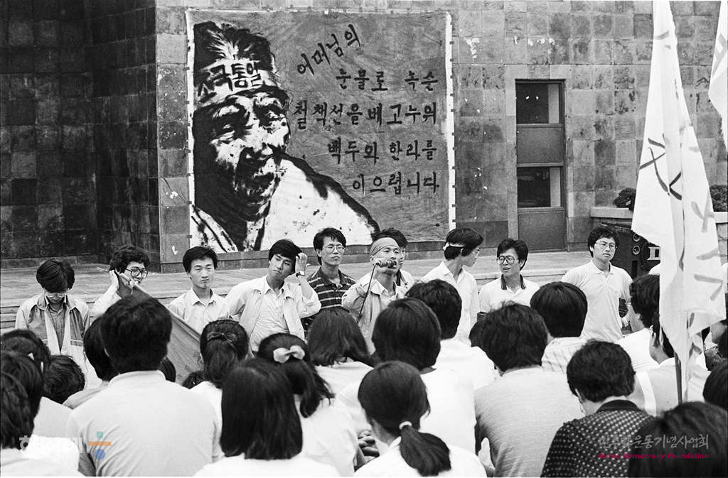 - 1988년 6월 9일 정부의 원천봉쇄 방침에 따른 강경대응에도 불구하고 6.10남북학생회담을 강행하기로 한 가운데 서울대 대학생들이 아크로폴리스광장에서 출정식을 하고 있다