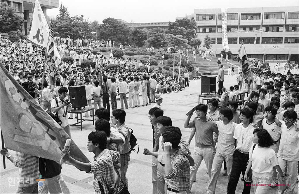 - 1988년 6월 9일 정부의 원천봉쇄 방침에 따른 강경대응에도 불구하고 6.10남북학생회담을 강행하기로 한 가운데 서울대 대학생들이 아크로폴리스광장에서 출정식을 하고 있다