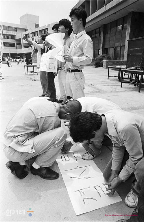 - 1988년 6월 9일 정부의 원천봉쇄 방침에 따른 강경대응에도 불구하고 6.10남북학생회담을 강행하기로 한 가운데 서울대 대학생들이 아크로폴리스광장에서 출정식을 하고 있다