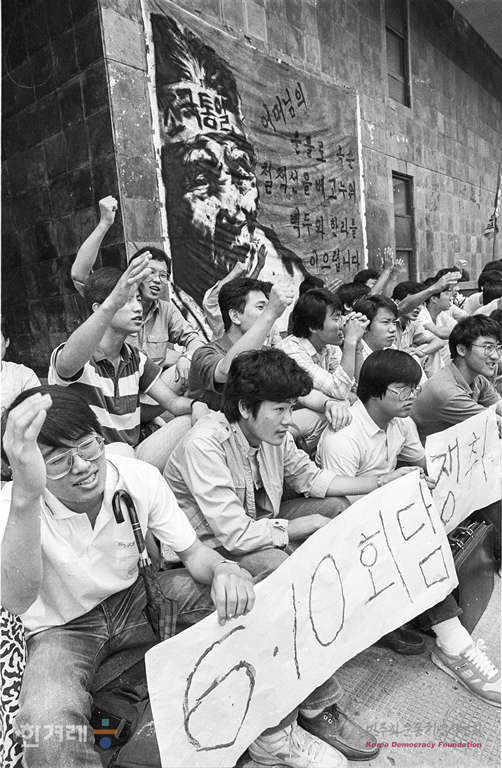 - 1988년 6월 9일 정부의 원천봉쇄 방침에 따른 강경대응에도 불구하고 6.10남북학생회담을 강행하기로 한 가운데 서울대 대학생들이 아크로폴리스광장에서 출정식을 하고 있다